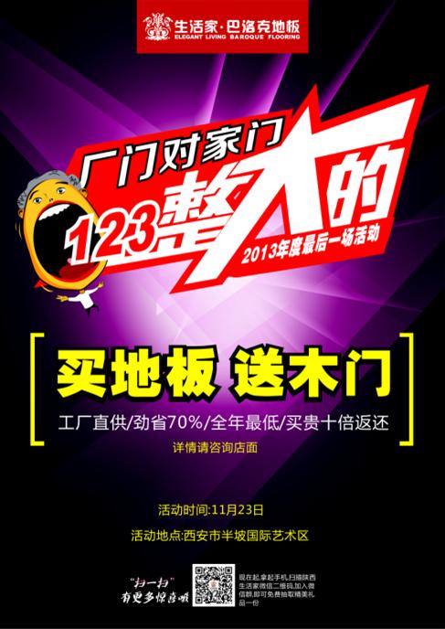 西安生活家2013年度最大優(yōu)惠壓軸呈現(xiàn)!買地板,送木門!工廠直供,勁省70%,全年最低。11月23日,與您相聚西安半坡國際藝術(shù)區(qū)。