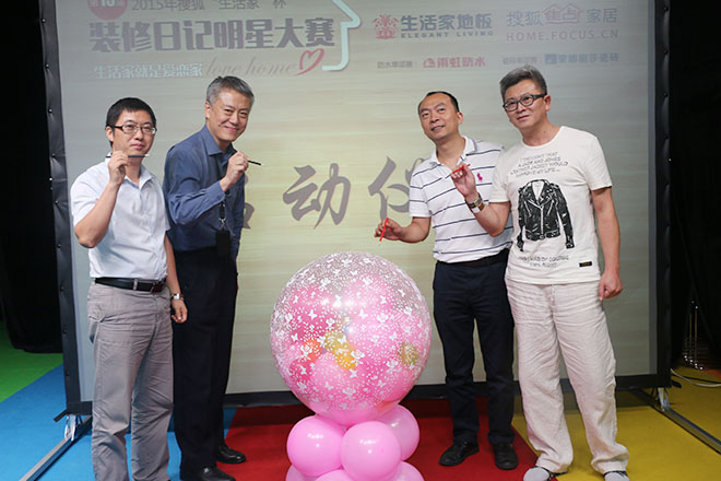 搜狐焦點家居副總經(jīng)理朱大暉先生、生活家地板企劃中心總監(jiān)詹宏先生、生活家地板老客戶于婷女士、北京裝修論壇總版主鵬游丹境以及2014年日記大賽全國總冠軍平民女De實木家裝應(yīng)邀出席了本次啟動儀式。